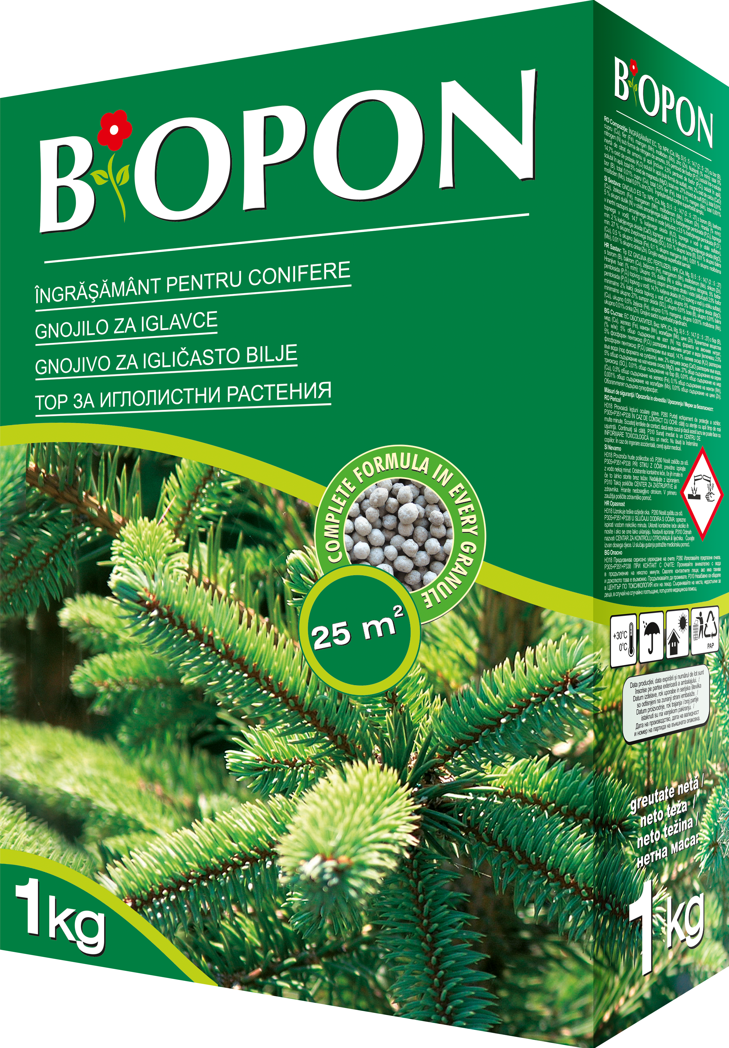 Ingrasamantul pentru conifere Biopon contine substante naturale. Este potrivit pentru toate soiurile de arbusti si conifere. Asigura o crestere echilibrata plantelor, care il asimileaza direct, dupa ploaie sau dupa udare. Contine magneziu si azot in cantitate ridicata. Azotul are rolul de a asigura culoarea verde, naturala, a acelor. Are si continut de fier, care impiedica ingalbenirea frunzelor. Este usor de utilizat si are un termen de valabilitate extins. De asemenea, are o remanenta indelungata in sol si nu necesita completarea cu alte ingrasaminte.
